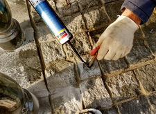 В углу участка делаем лавочку. Брусчатку под её ножками зачищаем, всё выставляем по уровню, для дополнительной надёжности конструкция удерживается е только на клею, но и на штырях. Параллельно делаем верх одного из памятников.